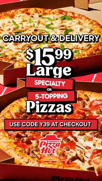 Your local Pizza Hut is NOW OPEN! We’re celebrating with $5 off any $20 purchase! Simply enter promo code C6 online at checkout. Code valid online only and not combinable with any other offers. Excludes tax, delivery charge, and tip. We look forward to serving you!